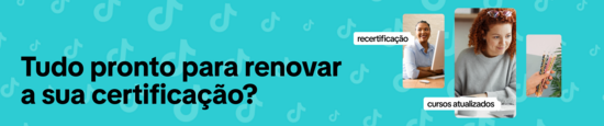 O seu Certificado de profissional em compra de mídia do TikTok é válido por dois anos a partir da data da sua aprovação na prova. A recertificação mantém a sua credencial atualizada e demonstra que você está em dia com as práticas recomendadas, os recursos e as políticas mais recentes de produtos de anúncios do TikTok. Se você não fizer a recertificação antes da credencial expirar, será necessário fazer a prova de certificação completa novamente.