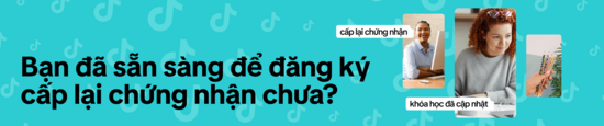 Chứng nhận chuyên gia mua nội dung truyền thông TikTok của bạn có hiệu lực trong hai năm kể từ ngày bạn vượt qua bài kiểm tra. Việc chứng nhận lại giúp bạn cập nhật chứng nhận của mình và chứng tỏ bạn nắm bắt các phương pháp hay nhất, tính năng và chính sách mới nhất về sản phẩm quảng cáo của TikTok. Nếu không chứng nhận lại trước khi chứng nhận hết hạn, bạn sẽ cần tham gia bài kiểm tra cấp chứng nhận đầy đủ.