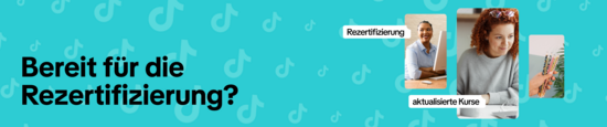 Die Rezertifizierungsprüfung ist zwar kürzer als die ursprüngliche Zertifizierungsprüfung, dennoch empfehlen wir dir, vor der Rezertifizierungsprüfung die aktuellsten Best Practices für TikTok Ads durchzugehen. Unten findest du einen maßgeschneiderten Lernpfad zur Rezertifizierung. Er enthält alle Themen, die du zum Bestehen der Prüfung brauchst. Dieser Lernpfad enthält: